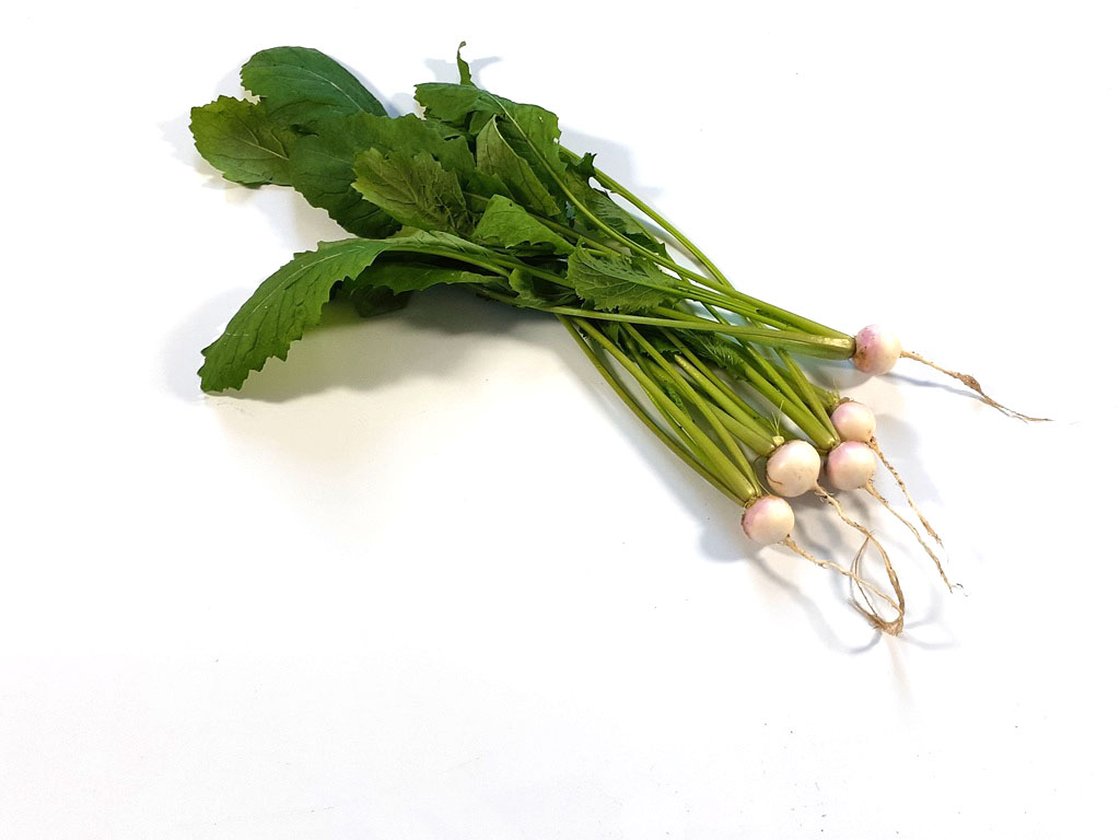 This pretty white and purple turnip has a more mild taste than radish. Can be used with or without the leaf.